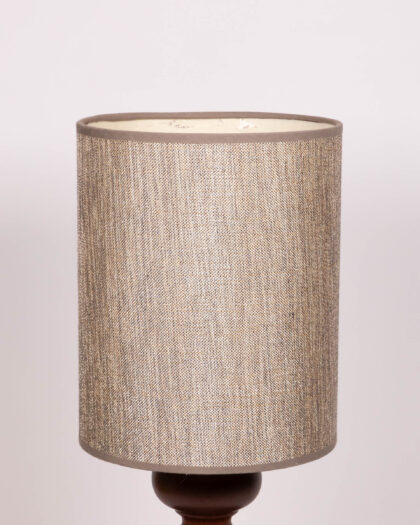 Vintage brown ceramic table lamp with a grey fabric shade. Ideal for adding a touch of retro style to any room.