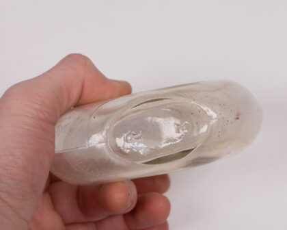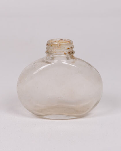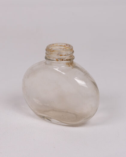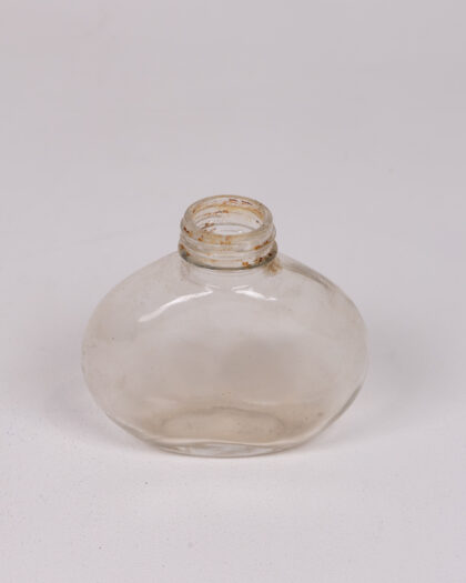 A vintage clear glass bottle featuring a rounded body and a distinct ribbed neck. The bottle is empty and made of transparent glass. It shows some signs of age, including residue around the neck and a slightly clouded interior, adding to its vintage charm. There is an inscription on the bottom, 'RD 3', and it is of an oval shape, the bottle could be used for decorative display. It has some surface dirt but is otherwise in good condition.