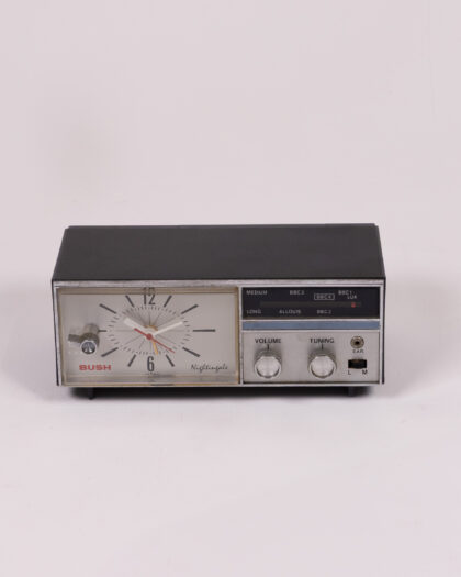 Vintage Bush 'Nightingale' clock radio. The casing is primarily black, with a silver-tone metal faceplate featuring the clock display, tuning dials and radio band information. The clock face has clear numerals and hands. The radio functions include medium and long wave bands, indicated by 'Medium' and 'Long', along with BBC radio stations. 'Bush' branding is visible on the clock face. The back features a tuning hole and maker's label.