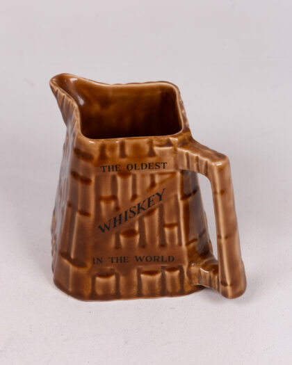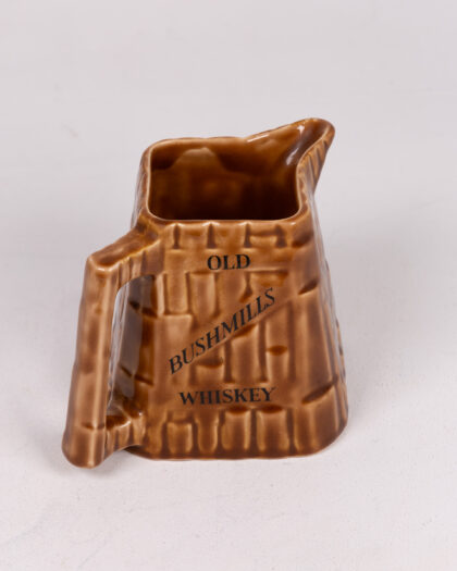 Vintage Old Bushmills Whiskey jug. Crafted from brown ceramic with a distinctive barrel design. Features the 'Old Bushmills Whiskey' logo on one side and 'The Oldest Whiskey in the World' on the other. Made by Arklow in the Republic of Ireland. The jug is in good condition, with no visible chips or cracks. A great collectible piece for whiskey enthusiasts.