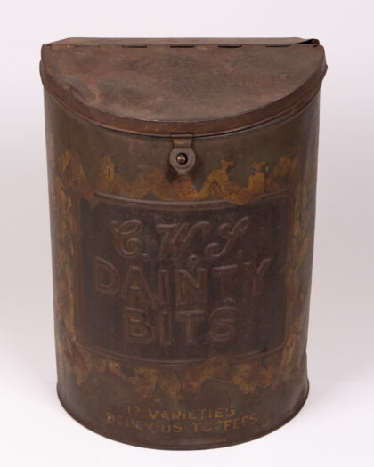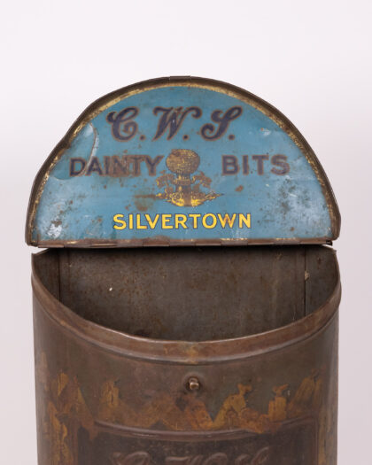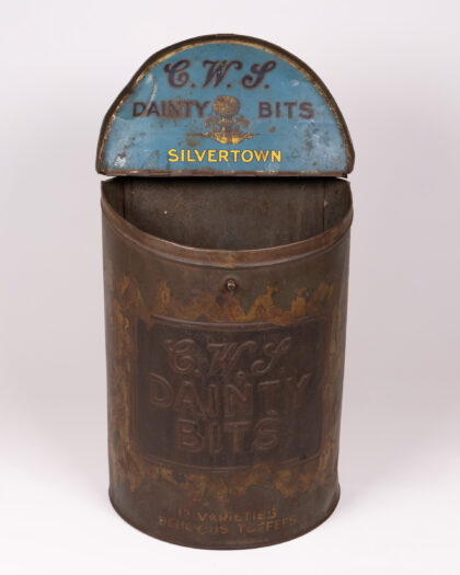 Vintage 'C.W.S. Dainty Bits' toffee tin with hinged lid. Displays 'Silvertown' inside. Showing signs of age but adds to its charm.