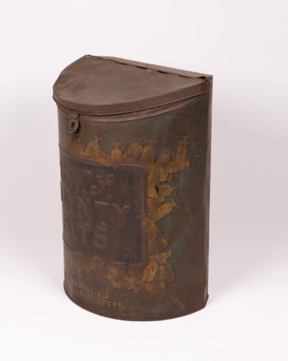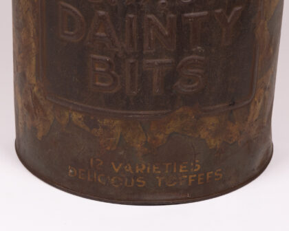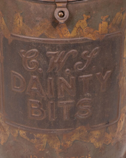 Vintage 'C.W.S. Dainty Bits' Toffee Tin. This charming, cylindrical tin once held 12 varieties of delicious toffees, as indicated by the inscription on the front. The tin features a hinged lid that lifts to reveal the inside. The lid displays a blue background and text, 'Silvertown'. Showing signs of age and wear, including rust and weathering, but this adds to its authentic vintage appeal. Ideal for collectors of vintage tins or those looking for a unique decorative item, this toffee tin brings a touch of nostalgia to any space.