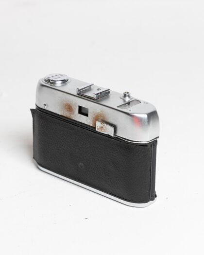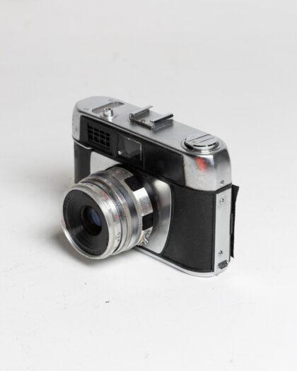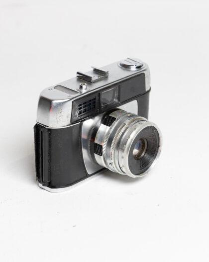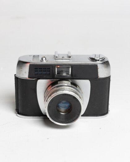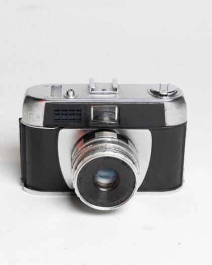 This vintage camera showcases a timeless design, featuring a metal body with signs of age and wear. Ideal for collectors or as a decorative prop, it adds a touch of nostalgia to any setting. This item has not been tested, we cannot verify if it is working or not and is sold as a prop only.