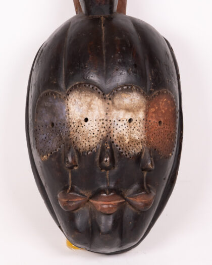 A Mboulu Monkey mask from Cameroon, Boulou monkey features two muzzles and three eyes, symbolizing its magical power of divination and protectionA striking, authentic statement piece for home decor.