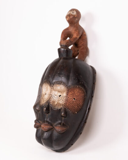 A Mboulu Monkey mask from Cameroon, Boulou monkey features two muzzles and three eyes, symbolizing its magical power of divination and protection. This striking African tribal mask features a dark wood face with intricate details and a unique design. The mask has three faces carved into it, each with a different expression. The eyes are decorated with a white, porous material. A figure of a person sits atop the mask, adding to its unique character. The mask has a rugged, textured surface, highlighting its authentic tribal origins. This piece would be a statement addition to any home or collection.