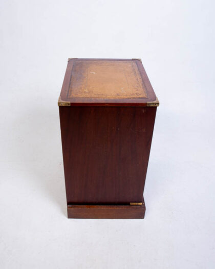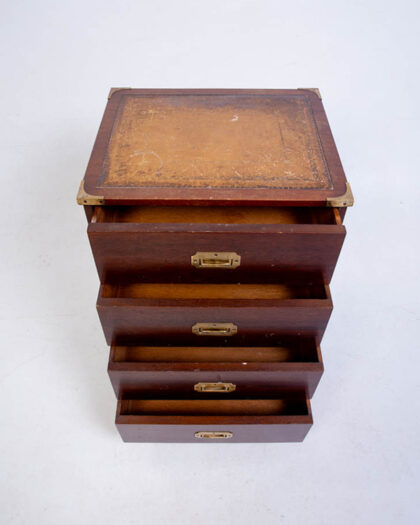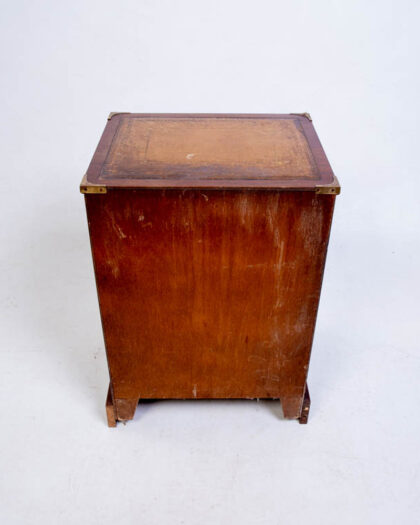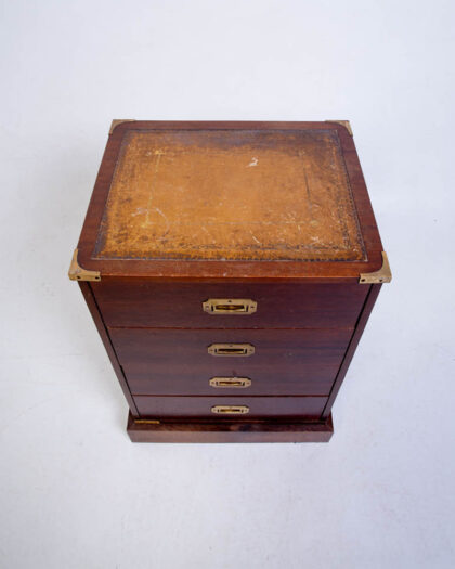 Campaign-style chest of drawers with four drawers and a leather-topped surface. Solid wood with brass hardware. Some age-related wear but overall good condition.