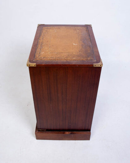 This is a vintage campaign-style chest of drawers, featuring a solid wood construction, a leather-topped surface, and brass hardware. The chest has four drawers, each with brass pull handles and escutcheons. The corners of the chest are reinforced with brass corner protectors. The leather top adds a touch of sophistication and provides a smooth surface for display or use. The overall design is reminiscent of campaign furniture, designed to be portable and durable for military use. The piece exhibits some age-related wear and patina. There are scuffs, marks, and wear commensurate with age. This stylish chest of drawers can be used in a living room, bedroom, or home office.