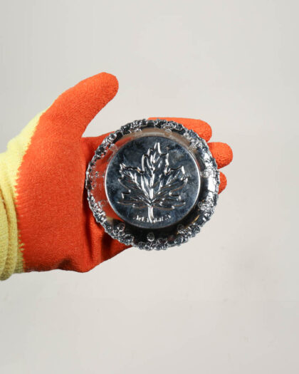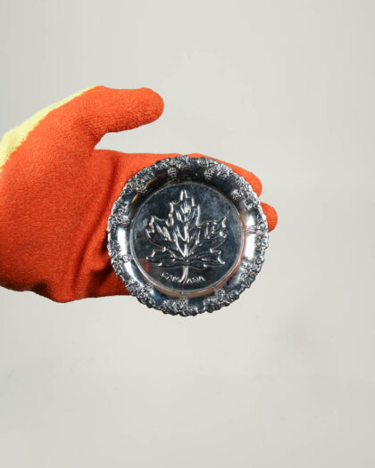 Vintage circular metal souvenir dish with a raised maple leaf design and floral-style border. Marked 'Canada'. Some tarnishing.