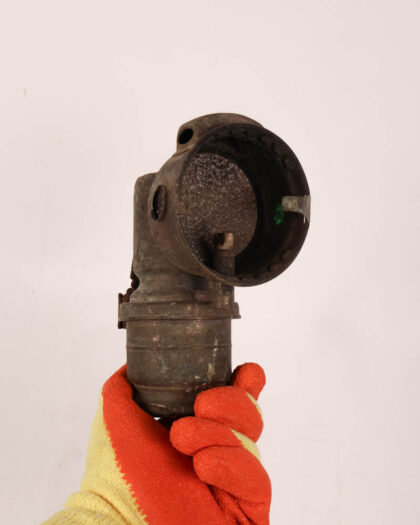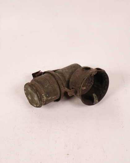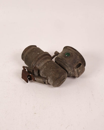 This is a vintage carbine lamp with a sturdy construction featuring a protective cage surrounding the main lamp body. The lamp incorporates a green glass lens for visibility. The brass components exhibit signs of wear and patina, adding to its authentic vintage appearance. This miner's lamp would make an interesting display piece for a home office, study, or any space where vintage industrial items are showcased.