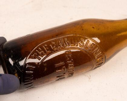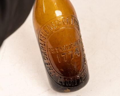 Vintage amber glass beer bottle, embossed with "The New Carlisle Brewery Company Established 1774 Limited". The bottle shows wear consistent with age and use. Minor imperfections in the glass are visible, adding to its vintage charm. The bottle is intact with a weathered cap. Displays well as a decorative antique item or Breweriana collectible.