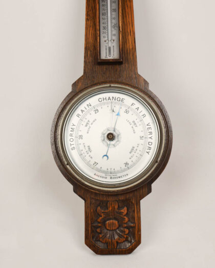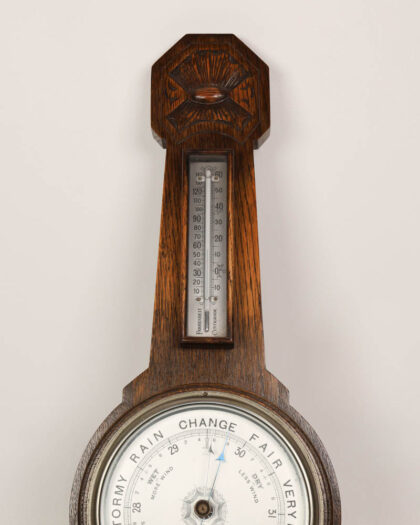 Vintage carved oak aneroid barometer featuring a thermometer. The barometer face has 'Aneroid Barometer British Made'. Good condition with some age-related wear.
