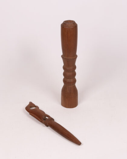 This is a vintage carved wooden ornament featuring a stylized bird perched atop a decorative stand. The piece has a rich, warm brown hue and showcases the natural wood grain. The bird carving is simple yet expressive, with an opening in its body adding to its charm. The stand is intricately detailed with carved sections that create a visually interesting texture. The ornament is in good condition, showing minimal wear consistent with its age. This unique piece would make a great addition to any collection or as a standalone decorative item in your home.