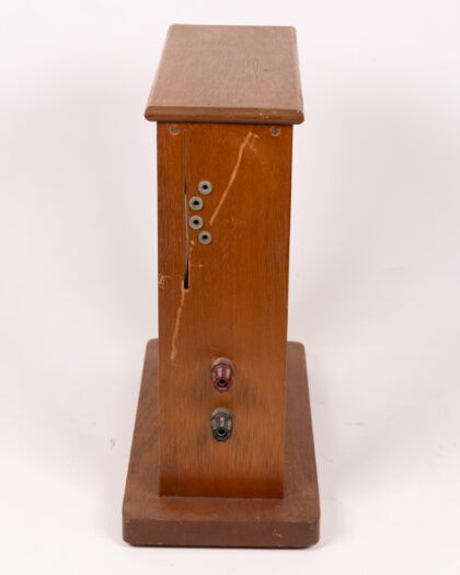 This vintage instrument features a wood and clear acrylic case that houses a central measuring apparatus. The exterior case has a solid wooden base and top, with clear acrylic panels allowing viewing of the instrument inside. The measurement mechanism consists of a central metal frame with a dial and wires leading to several terminals on the side of the apparatus. The wood of the case shows signs of wear including some chipping and marks on the sides. The acrylic is in good condition with just some minor surface scratches visible. The metal components inside the case appear original, contributing to the item's vintage charm. An intriguing and collectable piece.