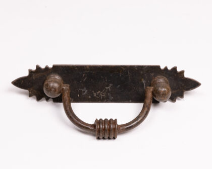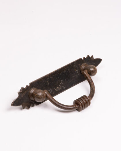 Discover this authentic set of eight vintage cast iron pull handles, perfect for adding rustic charm to your furniture. Each handle features a distinctive decorative backplate with pointed edges and a looped pull, complete with a textured grip for comfortable use. The dark brown/black finish exhibits a beautiful patina, showing genuine signs of age and oxidation that enhance its antique appeal. Ideal for restoring period pieces, upgrading cabinets and drawers, or embarking on new craft and furniture projects, these durable handles offer both functionality and timeless character.