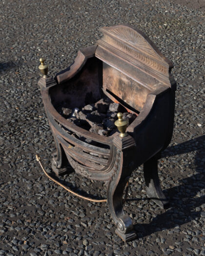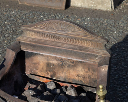Vintage cast iron fireplace grate and coal basket with ornate details. Weathered finish adds character.