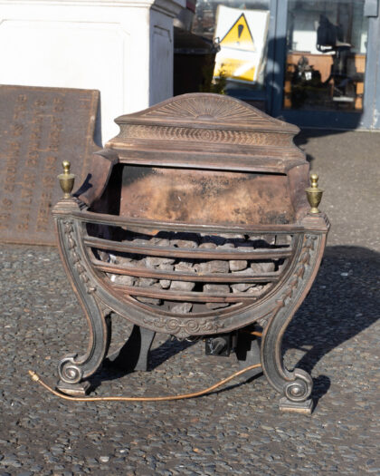 Vintage cast iron fireplace grate and coal basket. The grate has an ornate design with a sunrise pattern on the backplate and decorative floral elements on the legs. Shows signs of age and use, with rust and wear typical of vintage ironwork.