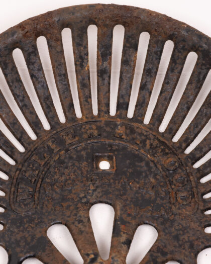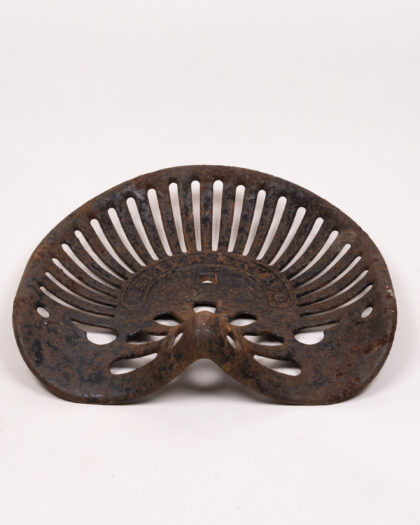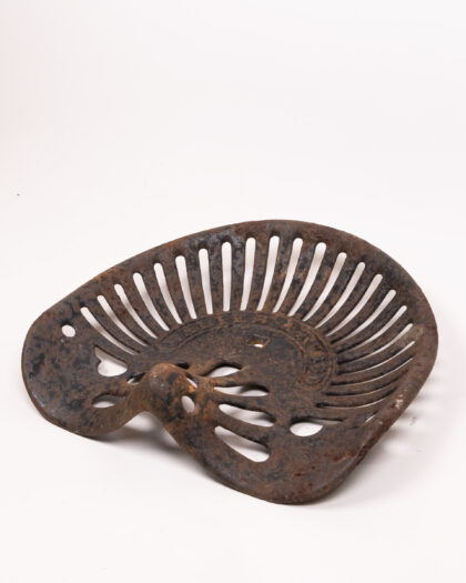 An old, distressed tractor seat crafted from cast iron. The seat displays considerable wear and rusting due to age and exposure to the elements, adding to its industrial aesthetic. A variety of holes and slot perforations provide ventilation. The seat could be restored and used as intended, or it could be repurposed into a piece of industrial furniture.