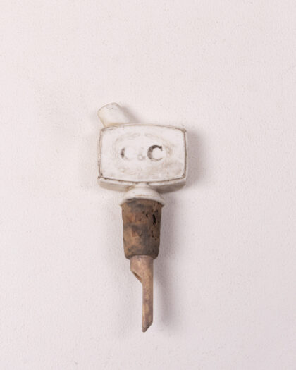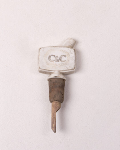 Vintage C&C branded spirit pourer. The pourer has a ceramic head and a wooden cork with metal spout. The ceramic head is marked with 'C&C' within a laurel wreath design. The pourer shows signs of wear commensurate with age and use, adding to its vintage charm. This item would make a great addition to a home bar, breweriana collection or display.