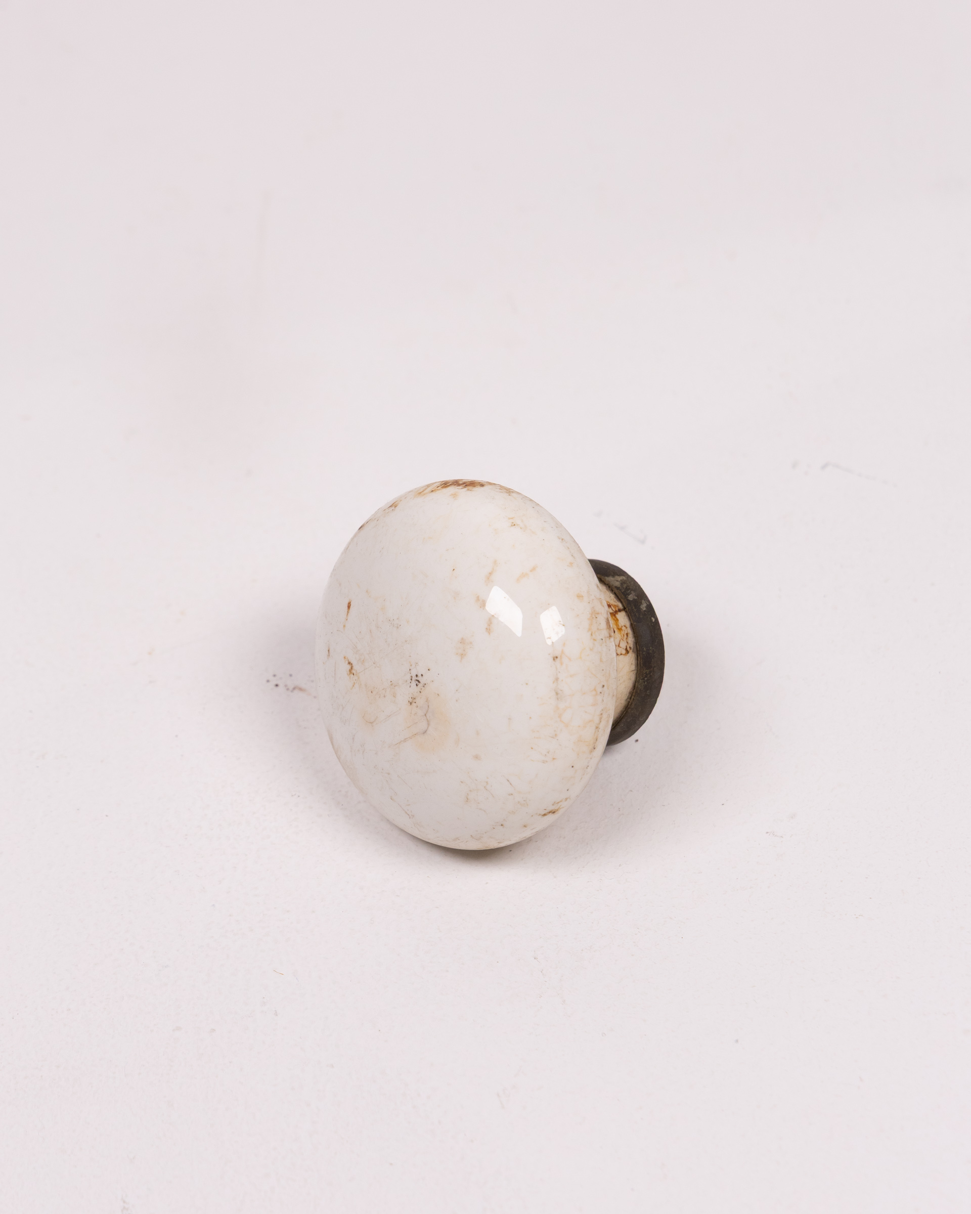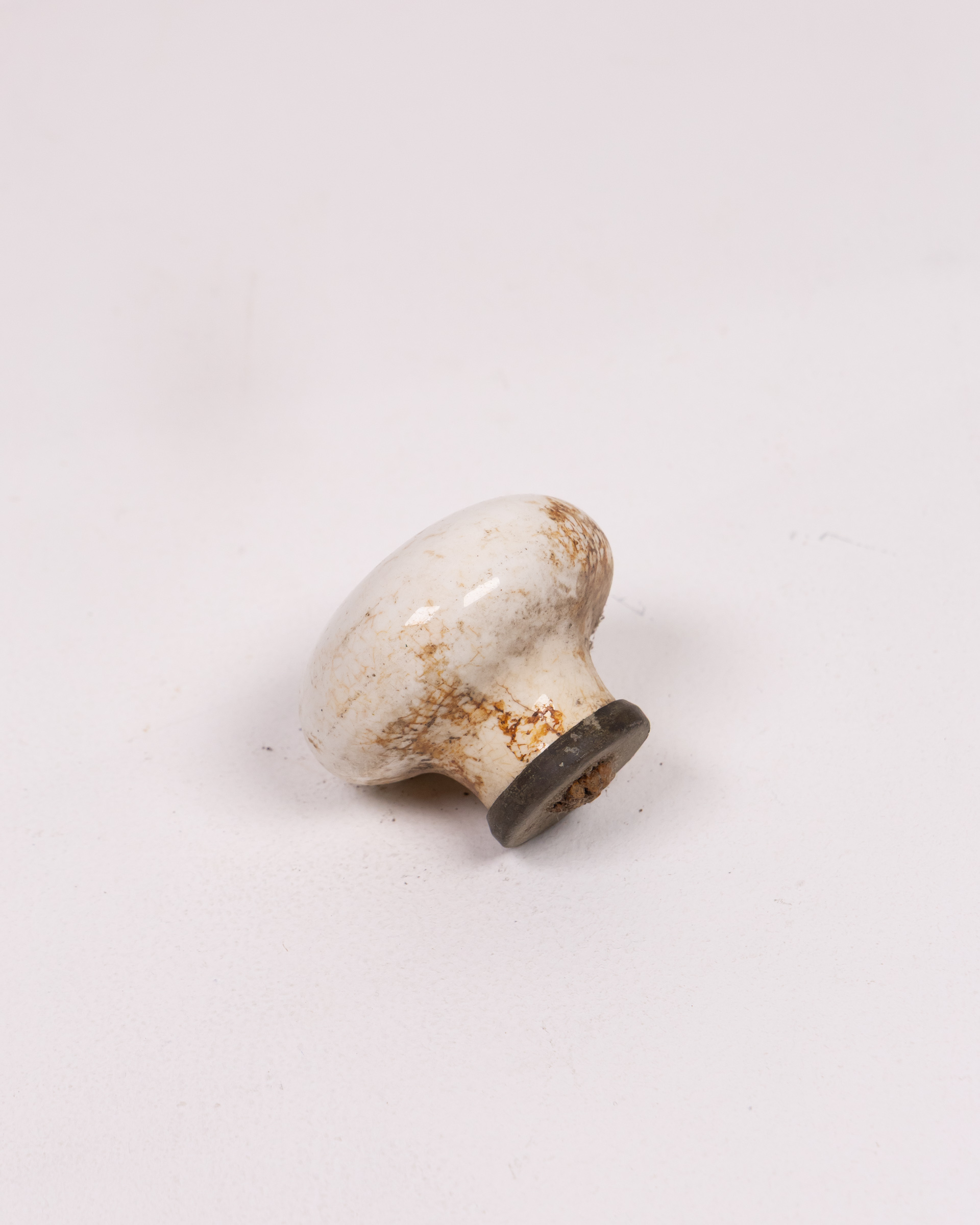 This is a vintage ceramic drawer knob, featuring a white ceramic knob with a patinated metal base. The ceramic has some signs of wear, discolouration, and minor imperfections, adding to its vintage character. The metal base shows some age and possible corrosion. This knob is perfect for replacing old hardware or adding a unique vintage touch to drawers, cabinets, or doors. Great for anyone looking to enhance their home decor with authentic vintage hardware.