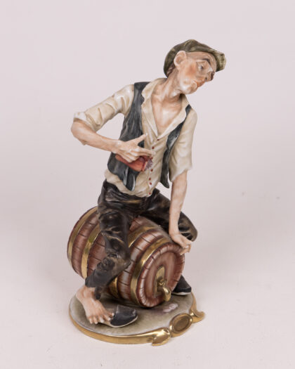 This charming figurine depicts a man seated upon a barrel with a tap. He holds a small brown jug aloft, seemingly having tasted its contents. The barrel is realistically rendered with wood grain and brass-coloured hoops and tap. The base of the figurine is trimmed with a gold band. The figure's clothes are dark trousers, with white shirt, a dark waistcoat, and black shoes, but no socks. The item is in good condition, although there are a couple of areas of missing paint on the man's toes. The base of the figurine is unmarked. Would suit a living room or bar area. Note 1 finger gone