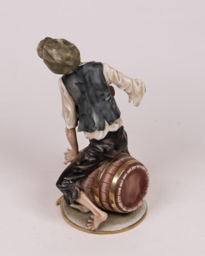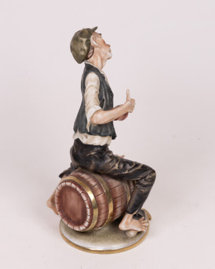 Figurine of a man enjoying a drink while sitting on a barrel. A unique piece in good condition, perfect for adding character to any room.