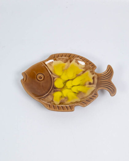 Vintage ceramic fish-shaped dish with brown and yellow glaze. In good condition, minor wear. Perfect for jewellery or small trinkets.