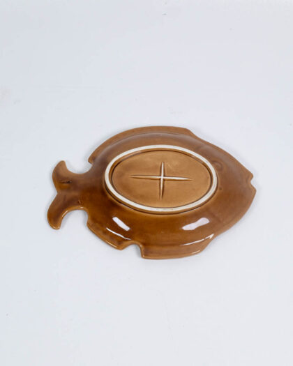 This is a vintage ceramic dish in the shape of a fish. The dish is glazed in brown, with a bright yellow glaze forming a decorative pattern in the centre of the fish. The fish has a detailed tail and fins. The underside shows the unglazed ceramic.