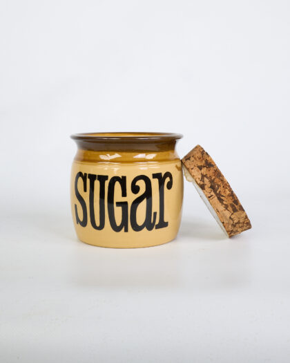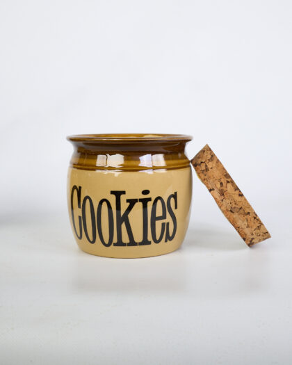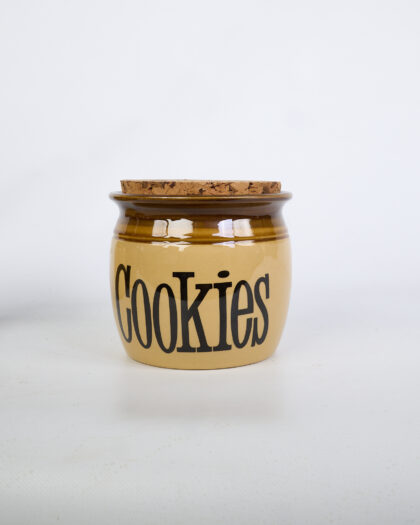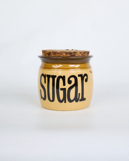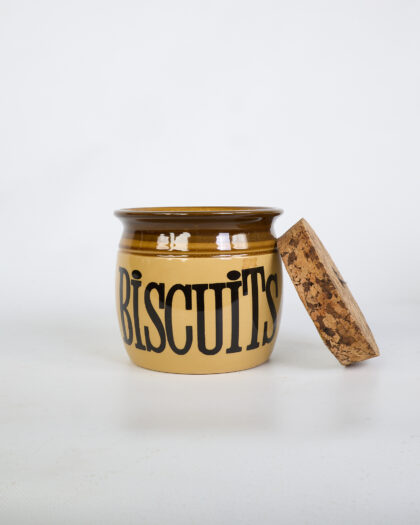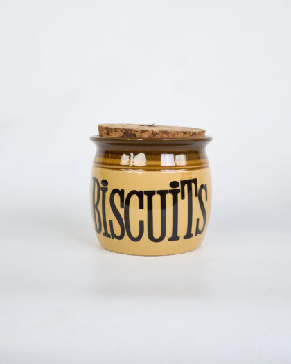 This is a set of three vintage TG Green ceramic kitchen storage jars, each with a cork lid. The jars are labeled 'Sugar,' 'Biscuits,' and 'Cookies' in a bold, black font. The jars feature a cream base with a brown rim. The brown glaze provides a glossy contrast to the cream ceramic. The cork lids fit snugly into the top of each jar. The jars have a rounded, cylindrical shape. The condition of the jars is good. They are ideal for adding a vintage touch to a kitchen while also serving as functional storage containers.