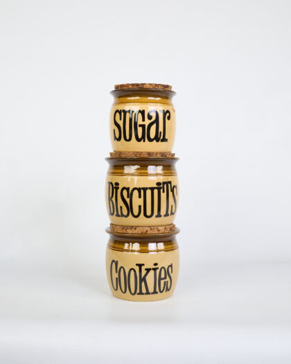 Set of three vintage ceramic kitchen storage jars with cork lids. Labeled Sugar, Biscuits, and Cookies. Good condition.