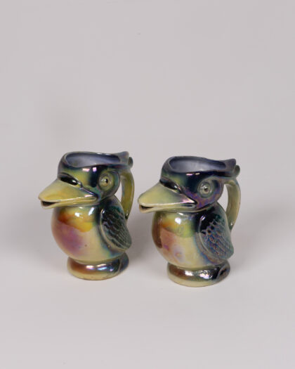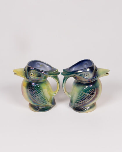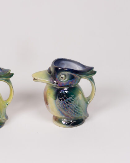 This is a charming pair of vintage ceramic creamers, each shaped like a Kookaburra bird. The creamers feature an iridescent glaze with blue, green, and yellow hues, creating a lovely shimmer. These unique little pitcher are perfect for serving cream or sauces, or displaying as decorative ceramic objects. The creamers are in good vintage condition, with minor signs of wear consistent with age and use