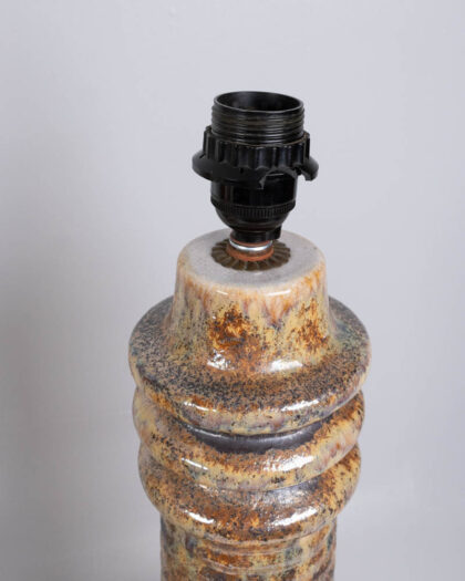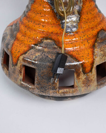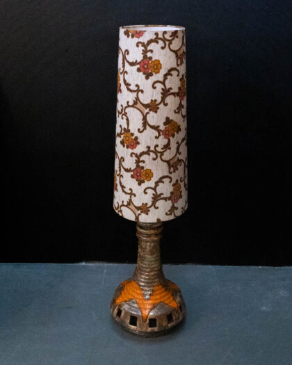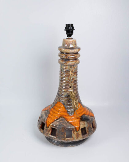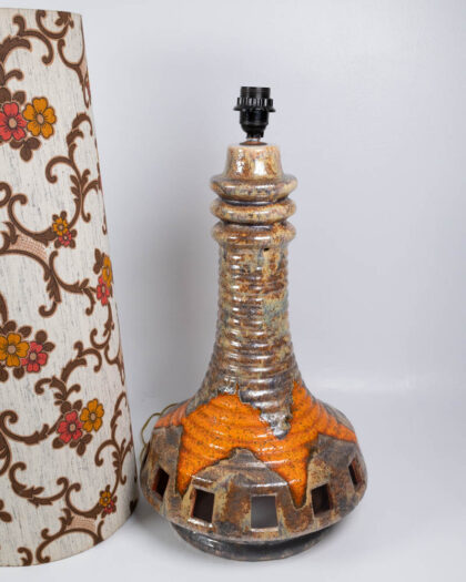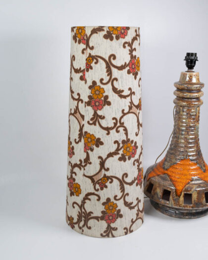 This is a vintage ceramic table lamp dating to the mid-20th century, possibly the 1970s. The lamp base is ceramic with a mottled brown and cream glaze, with splashes of orange around the base and upper section. The base features a cylindrical column shape that flares out at the bottom, with geometric cutouts around the base, infilled with glazed ceramic. The lamp is topped with a tall, cylindrical fabric shade with a bold floral pattern in cream, brown and orange. The floral pattern on the shade is a repeating vine design. The lamp is in good condition with some signs of wear and use. The ceramic base has a few minor imperfections in the glaze. This lamp would look great in a living room, bedroom, or home office, adding a touch of vintage style.
