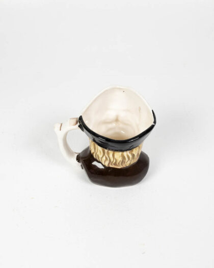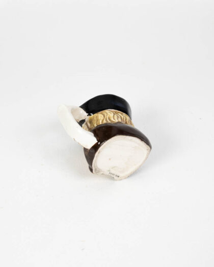 This vintage ceramic Toby Jug depicts a jovial gentleman wearing a black tri-corn hat with white trim, and a brown coat. The jug is shaped as his head and shoulders, with a handle forming part of his shoulder. The face features hand-painted details, including rosy cheeks and a smiling expression. Inside the jug, the ceramic is finished in white. The piece has a glossy glaze, giving it a polished appearance. Some minor wear is visible on the base. Would look excellent on a bar or shelf.
