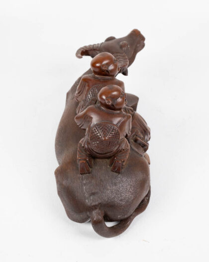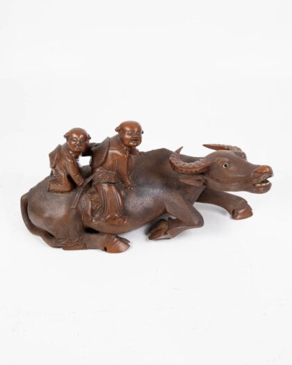 Vintage Chinese Carved Wood Ox with Two Figures Sculpture