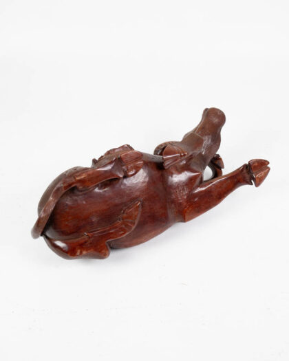 This vintage hand-carved wooden sculpture depicts a recumbent ox with two figures sitting on its back. The figures are carved with distinctive features. The ox itself is intricately detailed with realistic horns and a smiling face. The dark brown stained wood has a warm patina. This piece could be displayed in a living room, library, or office.