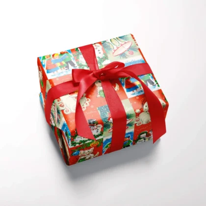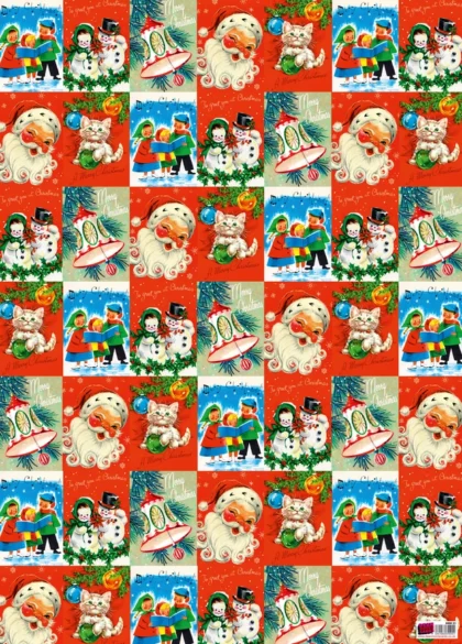 Add a touch of retro charm to your Christmas gifts with this vintage-inspired wrapping paper. Featuring delightful illustrations of Santa Claus, cheerful snowmen, carol singing children, and festive bells. The vibrant red, green and blue design creates a nostalgic feel. Ideal for wrapping presents for family and friends, this paper will bring joy to your holiday celebrations. Perfect for Christmas Eve gift exchanges or wrapping gifts for under the tree. A fun and festive design that evokes the spirit of the holiday season.