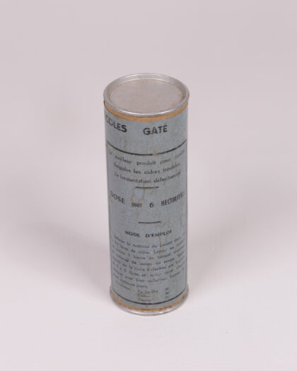 This is a vintage 'Le Clarifiant Gate' tin, a product from Laboratoire A. Gate. The tin is primarily grey with blue tinted sections, silver metallic trim and black printing. It is made of metal. The printing on the container details the product name and purpose for "cidres" or ciders and includes "Nombreuses Récompenses aux Expositions". There is wear and some minor corrosion, with small dents consistent with age. Likely dating to the early 20th century.
