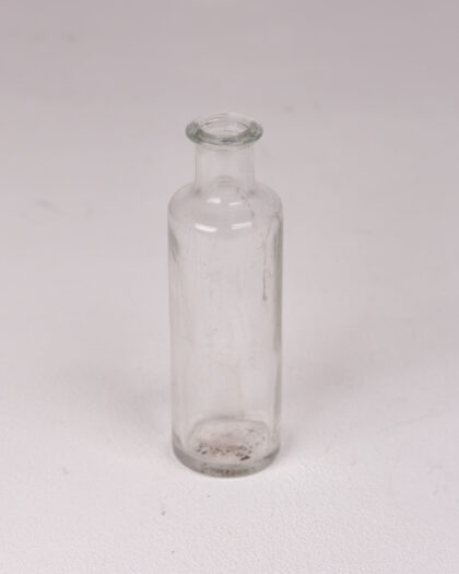 Discover this charming vintage clear glass bottle, featuring a classic apothecary style with a narrow neck and cylindrical body. This unique piece is empty, showcasing its original character with some visible sediment at the bottom and minor scratches and imperfections consistent with its age. These signs of wear add to its authentic vintage appeal. Ideal for decorative purposes, it can serve as a small, elegant vase for single stems, a distinctive addition to a collection of vintage glassware, or a charming vessel for storing small treasures. A versatile and timeless accent for any home.