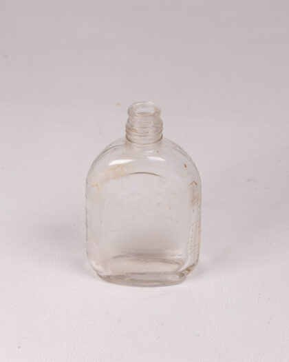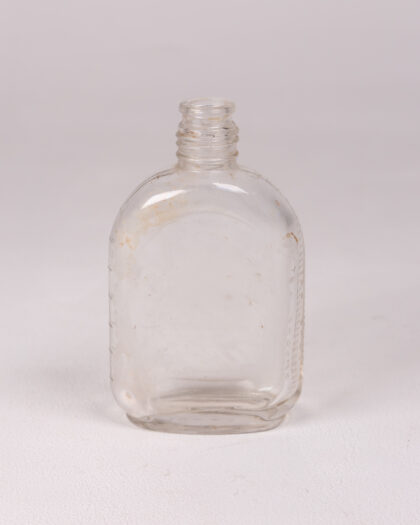 A clear glass bottle with a round body and a cylindrical neck. It features slightly rounded corners. The bottle has embossed writing on one side. While in fairly good condition, the bottle does have some light marks.