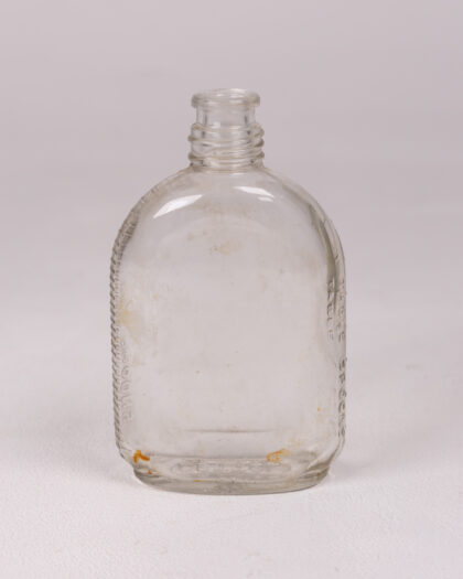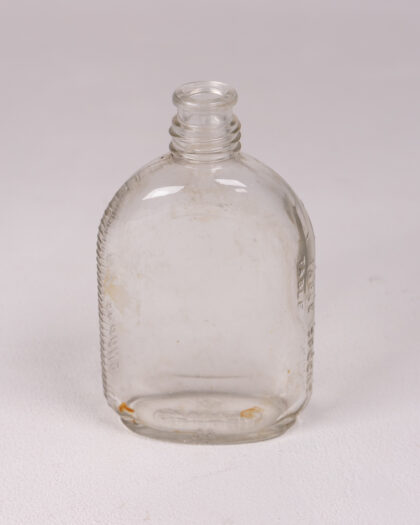 Discover this charming vintage clear glass bottle, likely dating from the early to mid-20th century. This unique piece features a distinctive flat, rectangular body with gently rounded shoulders and a threaded neck, indicating its original use for storing liquids. The glass is beautifully embossed with subtle text and patterns on its sides, adding to its authentic character. In good condition for its age, it exhibits only minor signs of wear and discoloration, which contribute to its antique appeal. Perfect as a decorative accent for your home, a small vase for a single bloom, or a unique addition to an apothecary collection.
