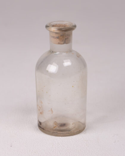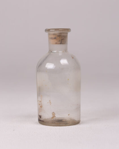 Discover a charming piece of history with this vintage apothecary-style clear glass bottle. Featuring a classic rounded body and a short neck, it is perfectly sealed with its original aged cork stopper. The glass itself tells a story, exhibiting subtle discoloration, signs of wear, and intriguing residue inside, all contributing to its authentic vintage character. This small bottle is an ideal decorative accent for a curated vintage collection, a unique prop, or a distinctive vessel for repurposing in your home or office. Its aged appeal adds a touch of rustic elegance and historical charm to any space.