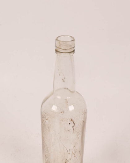 This is a clear glass bottle, likely dating from the mid 20th century. It has a rounded shoulder that leads into a long cylindrical body, and a narrow neck with a simple lip. The glass is clear, though it is slightly discoloured with age. Some surface dirt is present. This bottle could be displayed as part of a vintage glass collection or repurposed as a decorative vase.