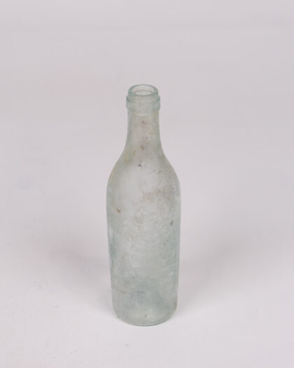 This is a vintage clear glass bottle, perfect for collectors or as a decorative item. The bottle has a classic shape with a narrow neck and a rounded body. It has some light cloudiness that enhances its antique look. The bottle is in good condition for its age.