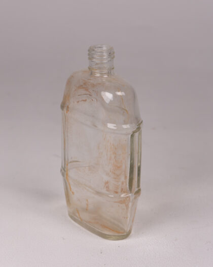 Vintage clear glass decorative bottle with a unique barrel design and aged orange patina, perfect as a small accent piece.