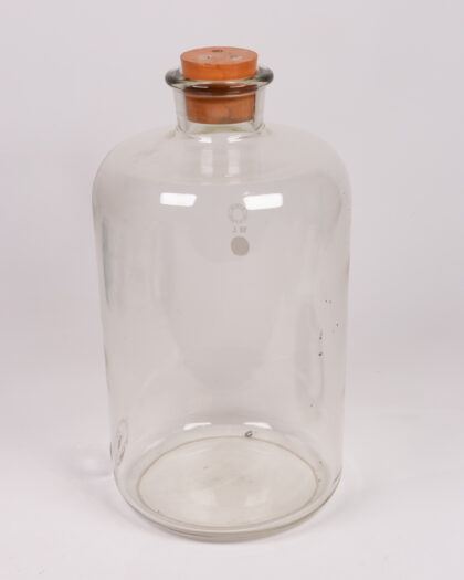This is a vintage clear glass storage jar. It features a solid wooden stopper. The jar has a 10L capacity marking on the glass. It would be great as kitchen storage or a decorative piece. There are minor signs of wear commiserate with age. The glass is in overall good condition.
