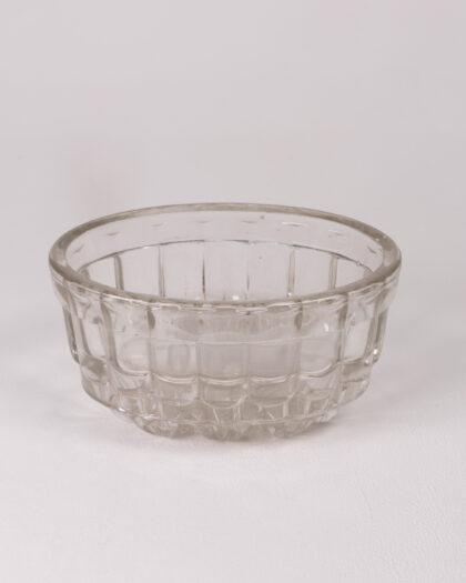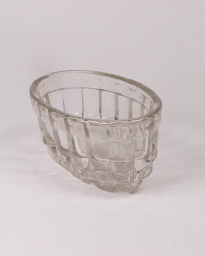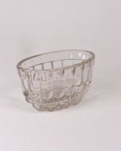 This is a vintage glass jelly mould with a clear finish and a distinctive ribbed design. The mould is made of clear glass and has a detailed pattern of vertical and horizontal ribs. It could be used for its original purpose or as a decorative item in the kitchen or dining room. It is in good vintage condition, with some minor signs of age. A charming piece of kitchenalia for collectors or those who enjoy vintage home decor.