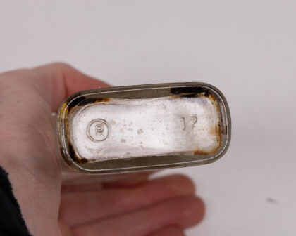 A vintage clear glass perfume bottle, featuring a unique rectangular shape with rounded edges and a narrow neck. The bottle exhibits an aged patina, with some residue and discoloration visible inside and out, enhancing its vintage appeal. The base is marked with an 'R' in a circle and '17'. Perfect for collectors of vintage glass or as a decorative item, adding a touch of historical charm to any display. The bottle is in fair condition, showing signs of age and use. A great addition to a vintage collection.