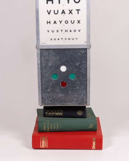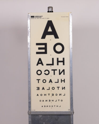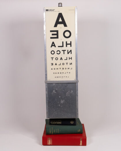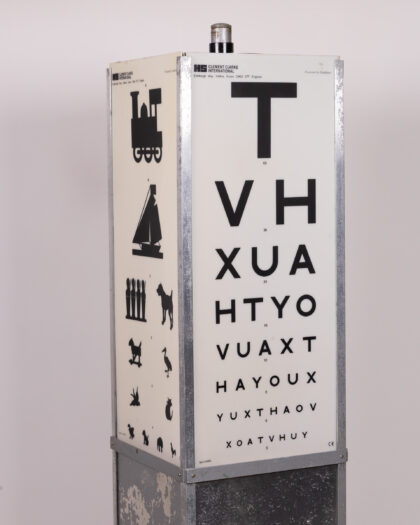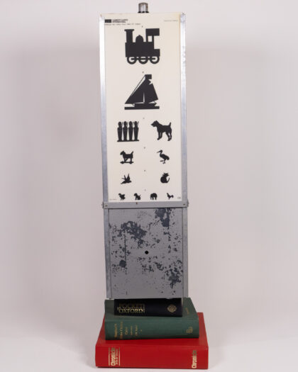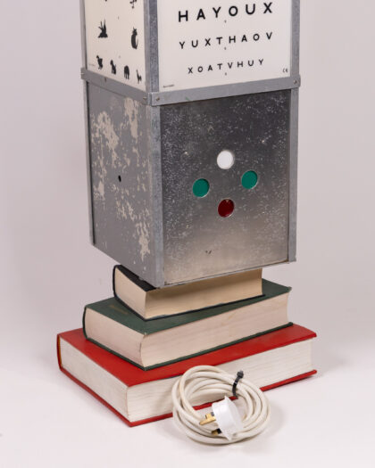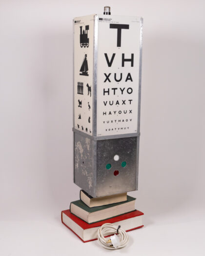 This is a vintage Clement Clarke International Eye Test lamp. The lamp has different eye tests on each of its four sides. The lamp includes a light at the top to illuminate the tests. The base is a grey metal. There are some cosmetic signs of wear to the metal casing, including some paint loss. The lamp is currently supported by some books in the images. The books are not included. A very unique and quirky lamp.