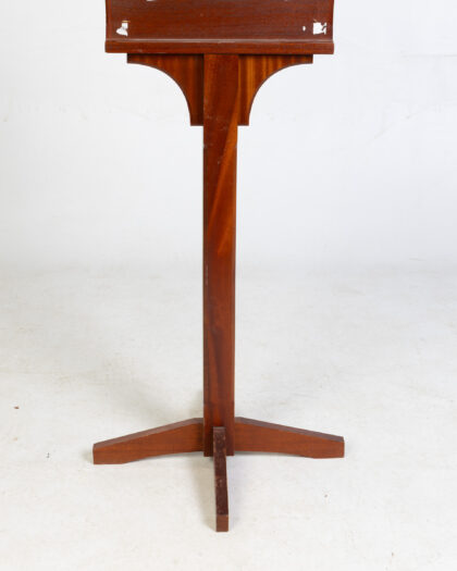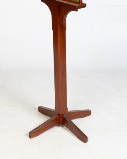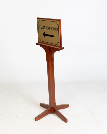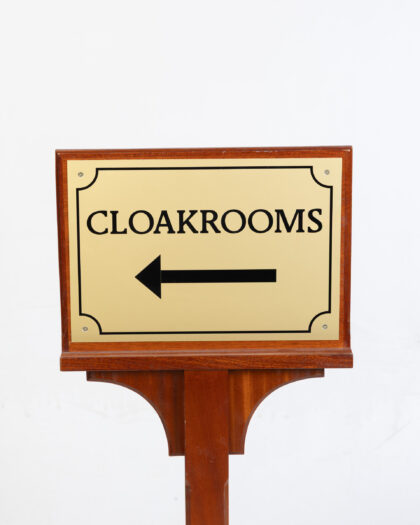 This is a vintage freestanding sign indicating the direction to the cloakrooms, with a left-pointing arrow. The sign features a brown wooden stand with a four-legged base for stability. The sign itself is gold with black lettering, encased in a wooden frame. The overall condition shows signs of wear and tear, particularly on the back and base of the wooden structure, with marks and possible old adhesive residue. This sign adds a touch of vintage charm and practicality to any establishment.