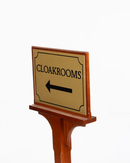 Vintage cloakroom direction sign. Freestanding design with a wooden stand and gold sign directing to the left. Ideal for adding character to any space.