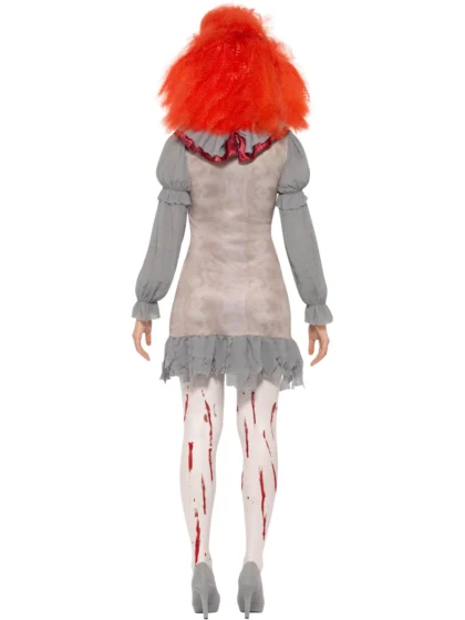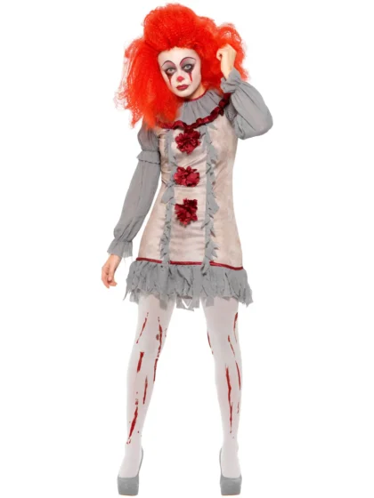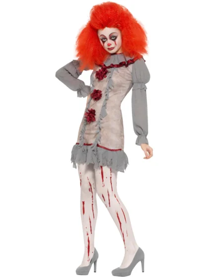 Grey and red clown lady costume, including dress and neck ruffle. Great for Halloween or fancy dress parties.